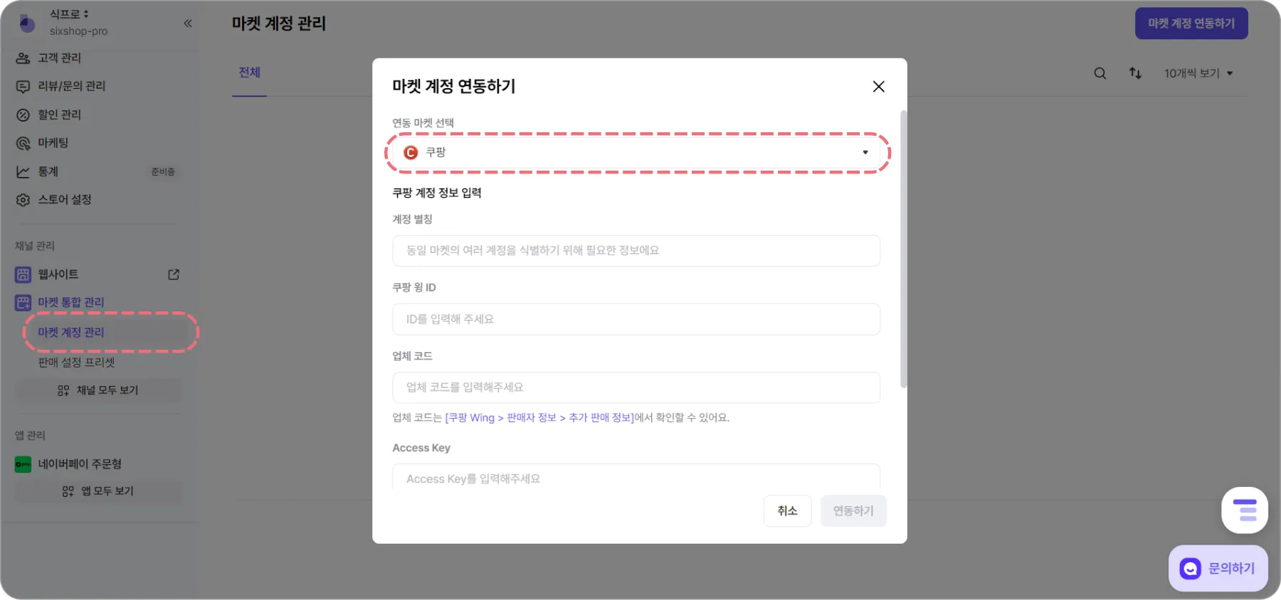 ① [식스샵 프로 > 채널관리 - 마켓 통합 관리 > 마켓 계정 관리]로 이동하여 마켓 계정 연동하기를 클릭해 주세요.