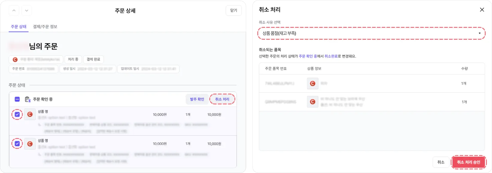 주문 상세에서 품목 단위 취소 처리할 수 있습니다.