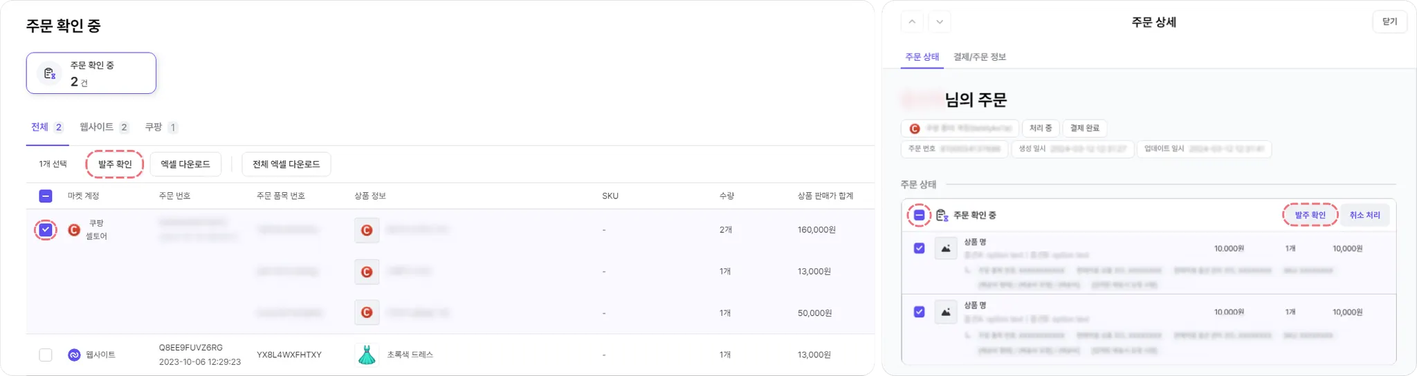 [식스샵 프로 > 주문 관리 > 주문 확인 중] 주문 목록 또는 주문 상세에서 쿠팡의 주문 번호 단위로 발주 확인 처리할 수 있습니다. 발주 확인된 주문은 배송 준비 중 상태로 변경되며 배송 처리 메뉴로 이동합니다.