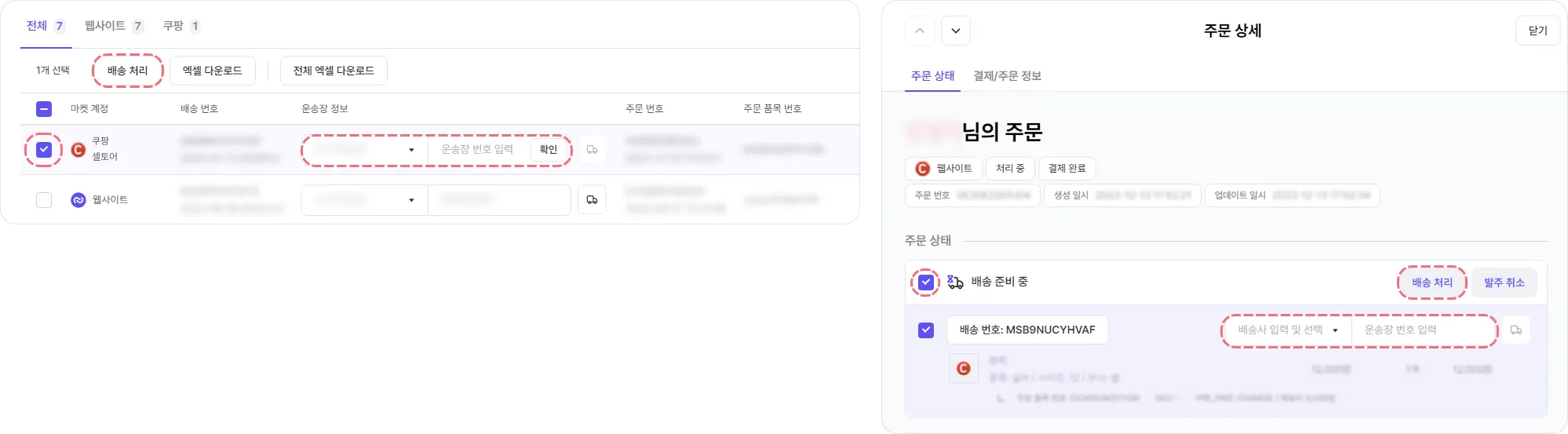 배송 처리 메뉴의 목록 및 주문 상세에서 배송 처리를 눌러 배송 처리할 수 있습니다.