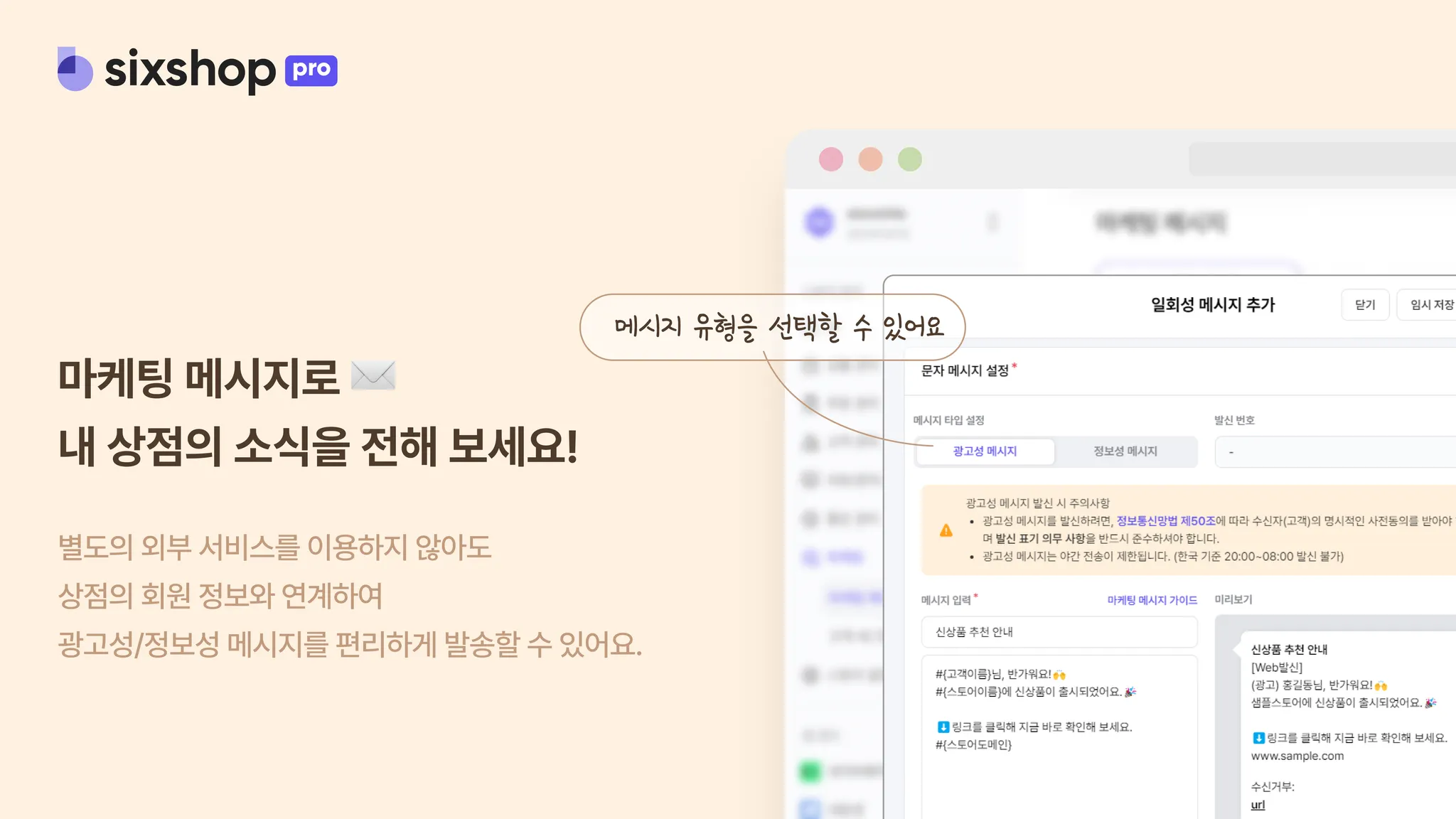 이벤트, 신상품 발매 등 광고성 메시지와 주문 관련 안내 사항 등 정보성 메시지를 문자 메시지(SMS, LMS)로 손쉽게 발송할 수 있어요. 예약 발송 기능까지 활용하면 더욱 편리해요.