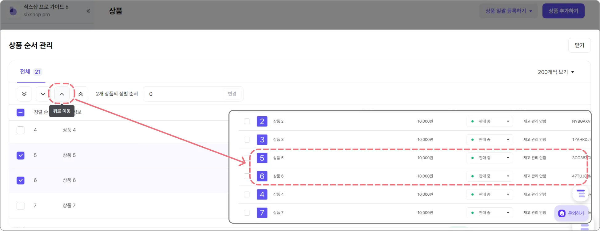Step 3. 왼쪽 상단의 화살표 아이콘 버튼으로 선택된 상품들의 순서를 변경해 주세요.