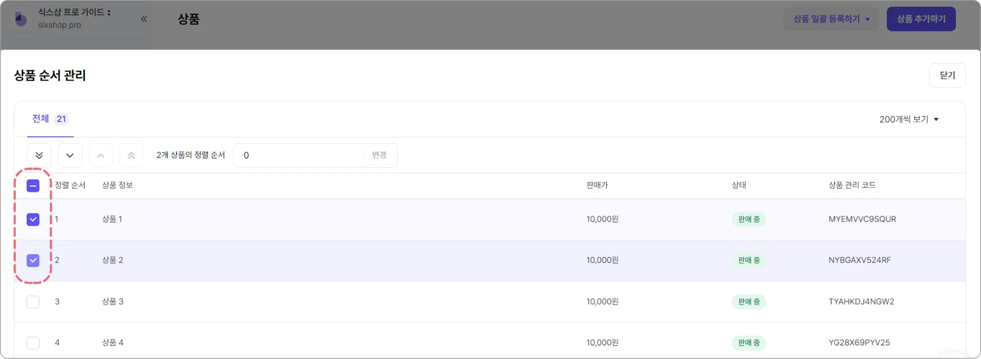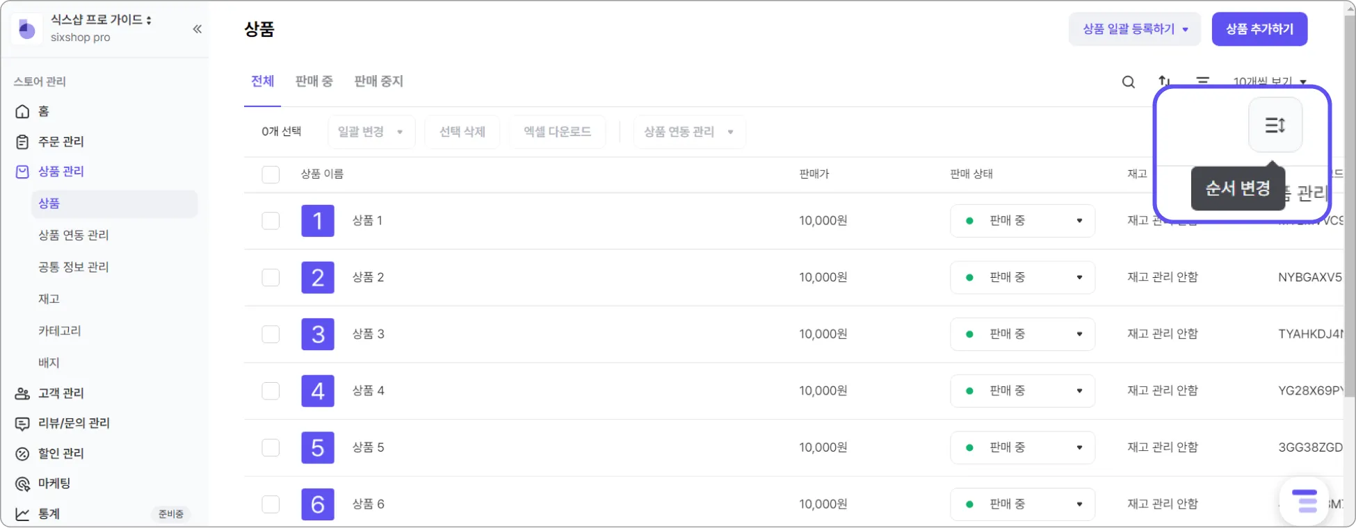 [식스샵 프로 > 상품 관리 > 상품]에서 상품 순서를 자유롭게 편집할 수 있어요.