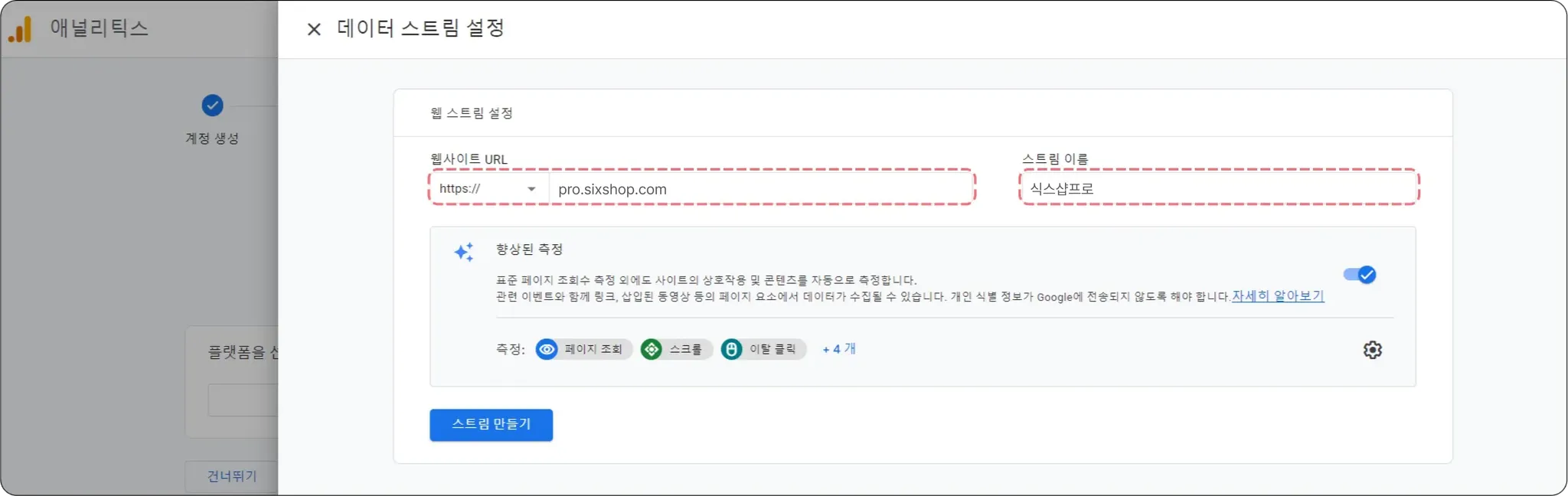 ⑨ 웹사이트 URL과 스트림 이름 입력 후 [스트림 만들기] 클릭