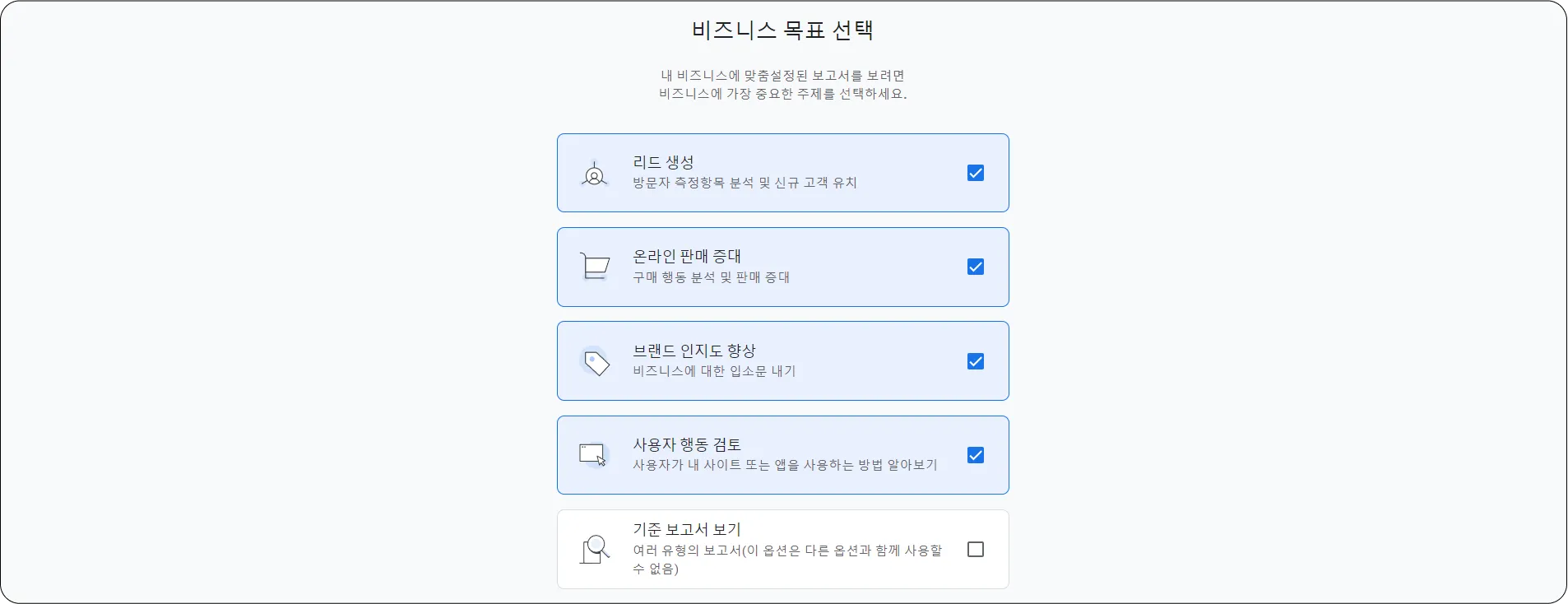 다양한 맞춤 설정 보고서를 보기 위해 아래 4개를 모두 선택하기를 권장합니다.