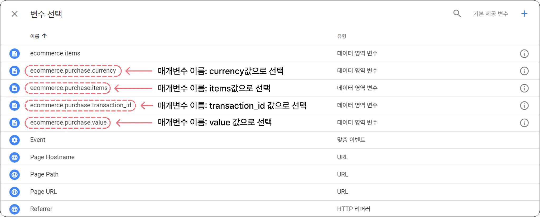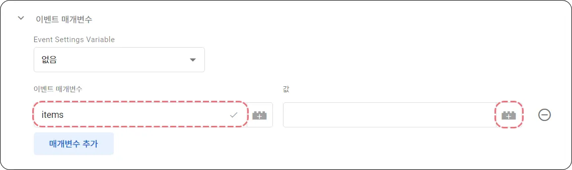 매개변수 추가를 클릭하여 이벤트 매개변수에 items를 입력하고, 값 오른쪽 추가 아이콘을 클릭하여 변수 ecommerce.items를 선택해 주세요.