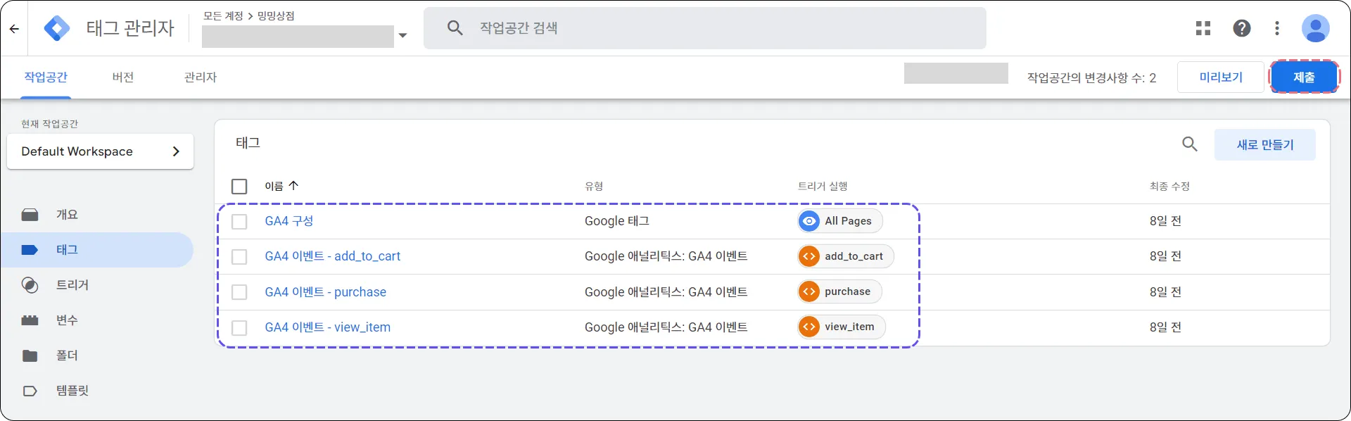 구글 태그 관리자에서 [태그 > 새로 만들기] 버튼을 눌러주세요.