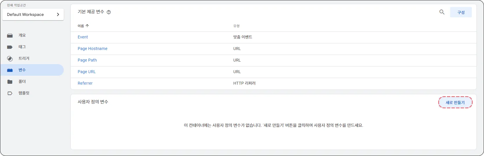 구글 태그 관리자 접속 후 [변수 > 새로 만들기] 버튼을 눌러주세요.