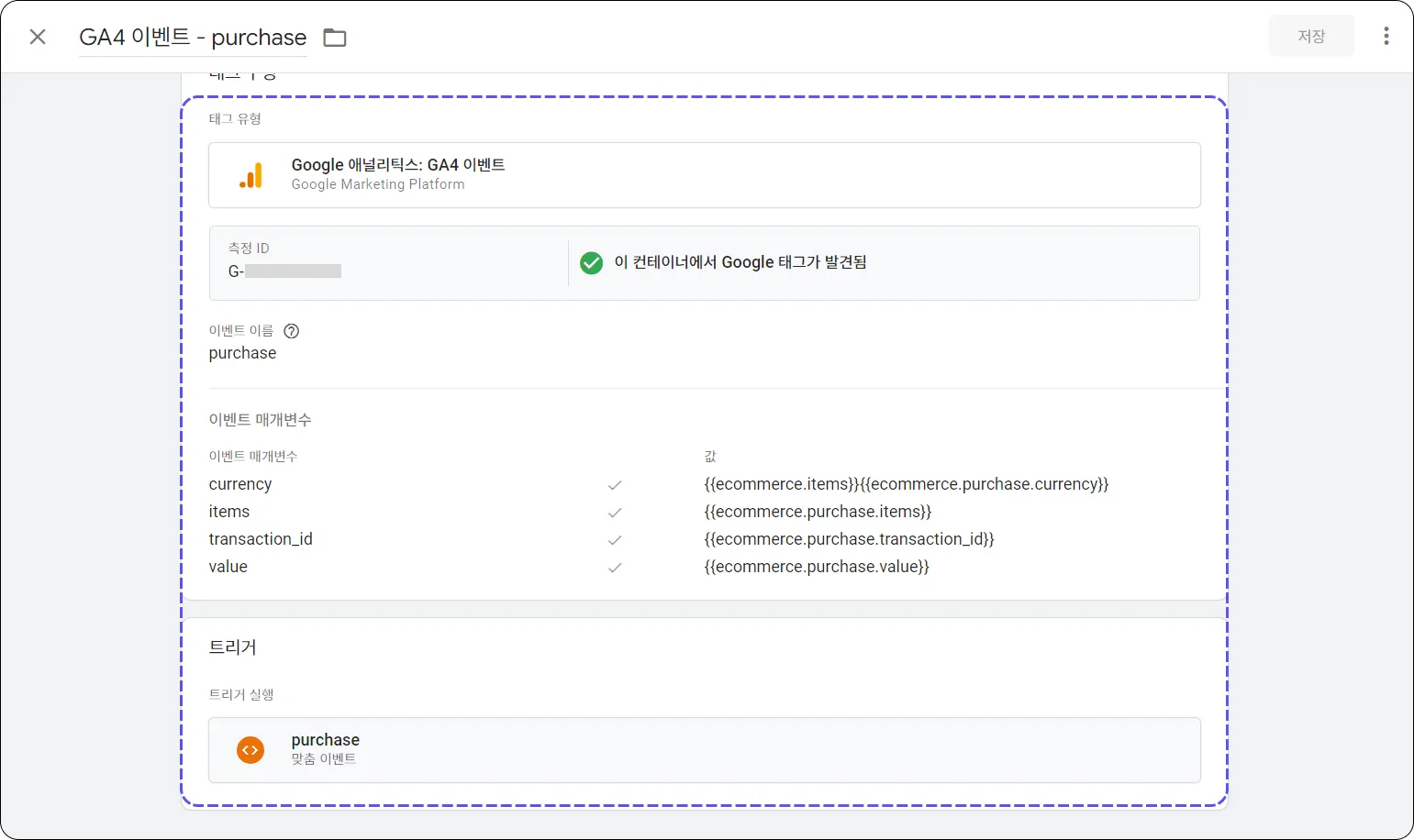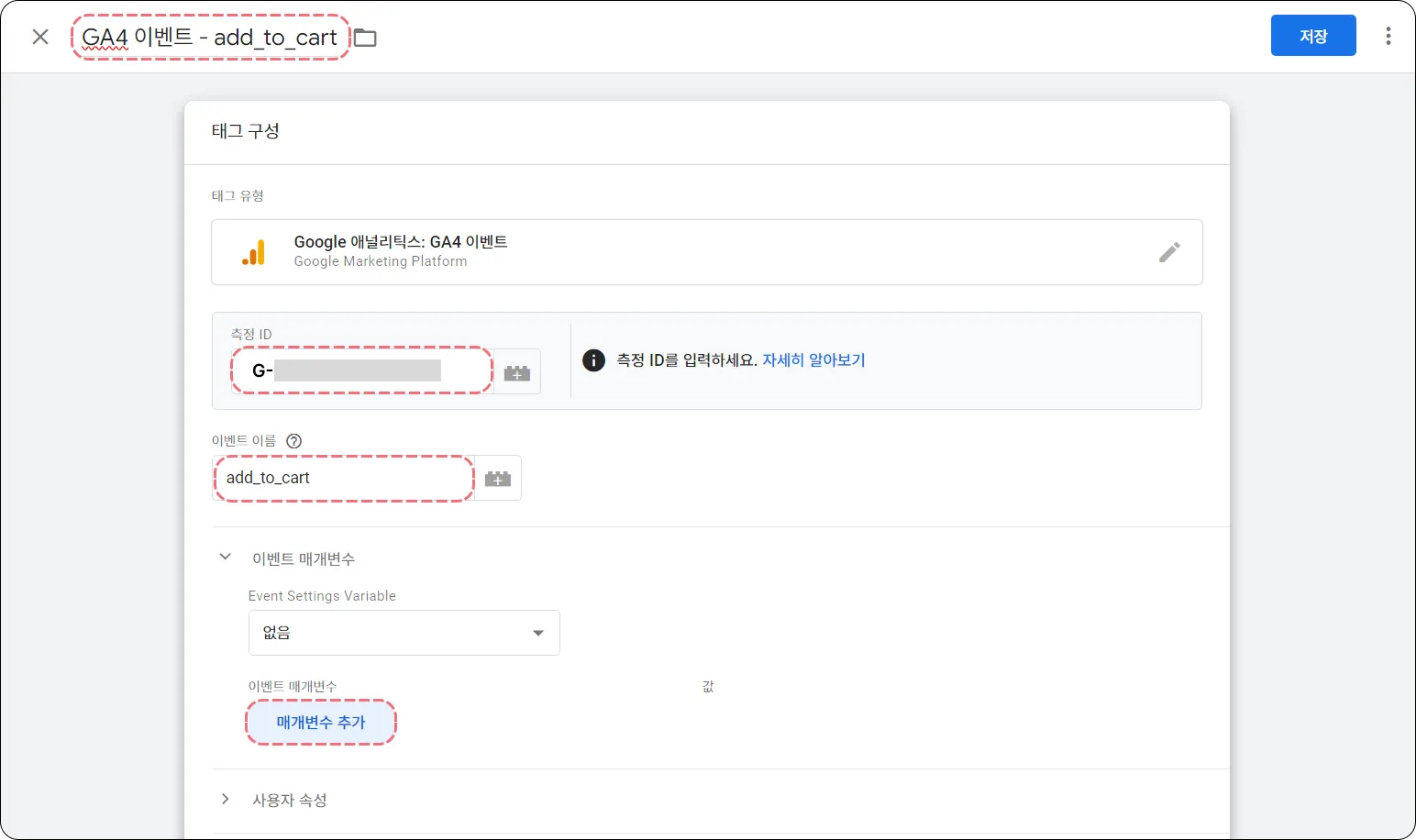 태그 측정 ID에 구글애널리틱스 추적 ID를 입력하고, 이벤트 이름에는 ‘add_to_cart’를 입력해 주세요.