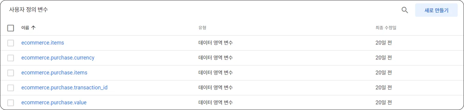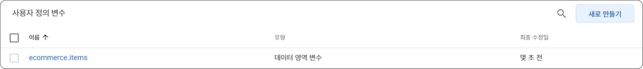 ecommerce.items 변수가 만들어졌어요. 1~4번 단계를 반복하여 변수 5개를 모두 저장해 주세요.