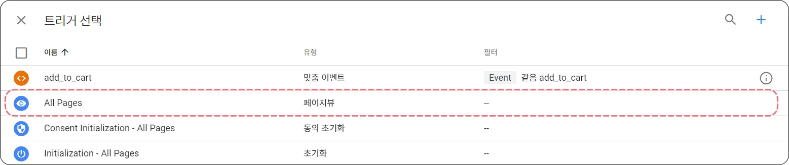 트리거 선택 아이콘을 클릭하고 트리거 All pages를 선택해 주세요.