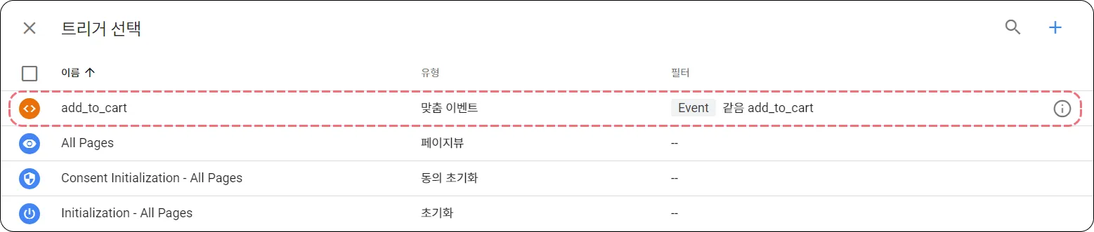 트리거 명 add_to_cart를 입력하고 트리거 유형 아이콘을 선택해 주세요.