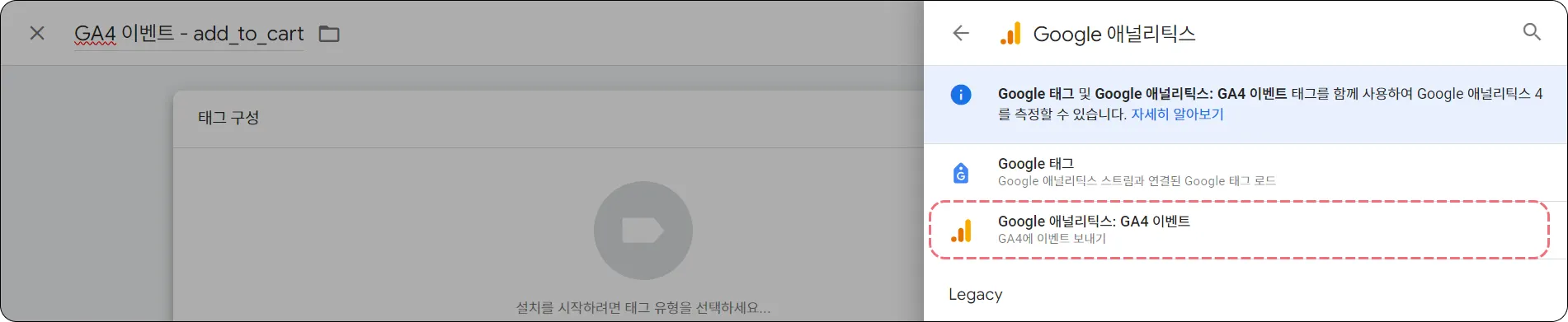 태그명 GA4 이벤트 - add_to_cart를 입력하고 태그 유형 아이콘을 선택해 주세요.