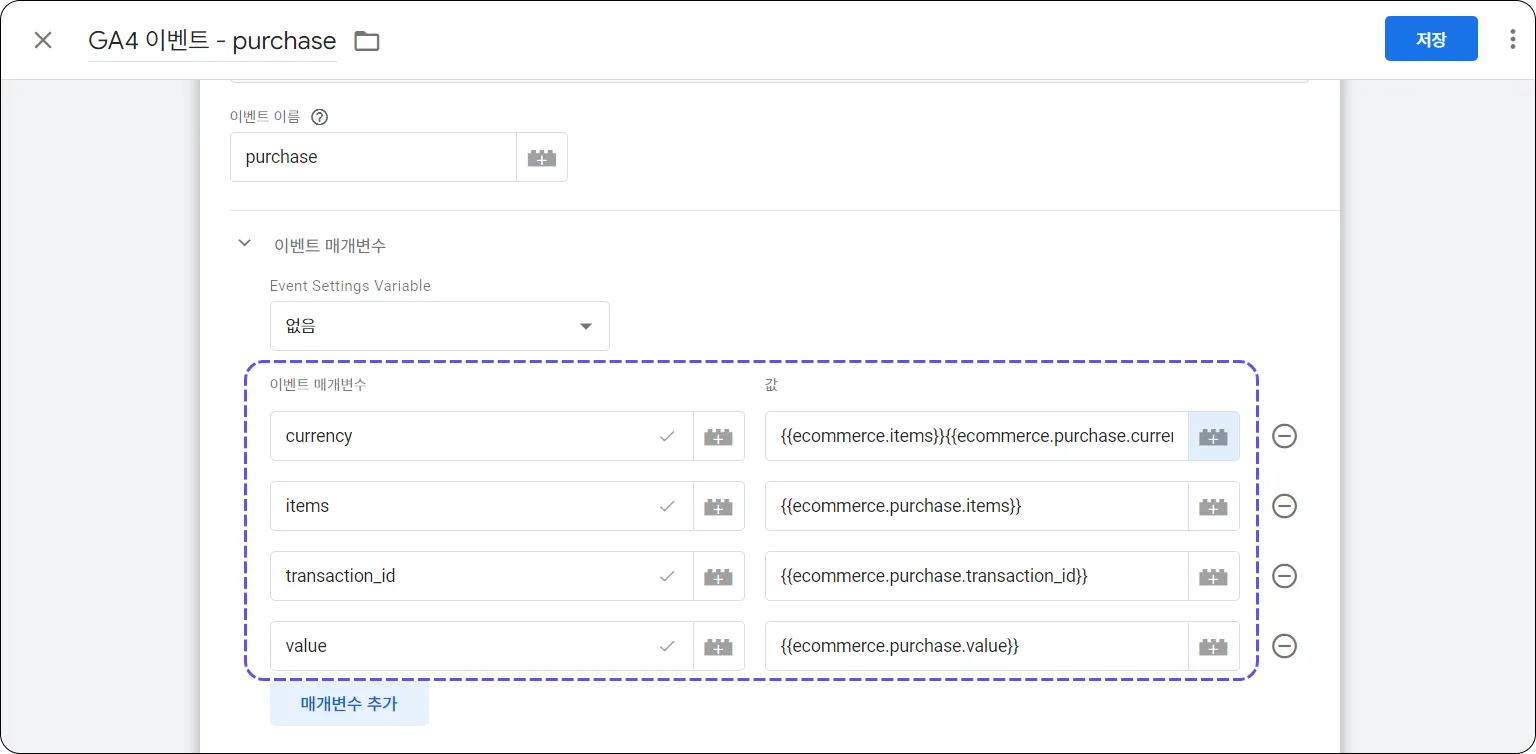 매개변수 이름: currency / items / transaction_id / value 총 4개 매개변수 추가하여 입력