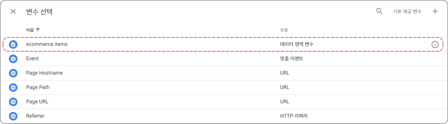 변수명 ecommerce.items를 입력하고 변수 유형 아이콘을 선택해 주세요.