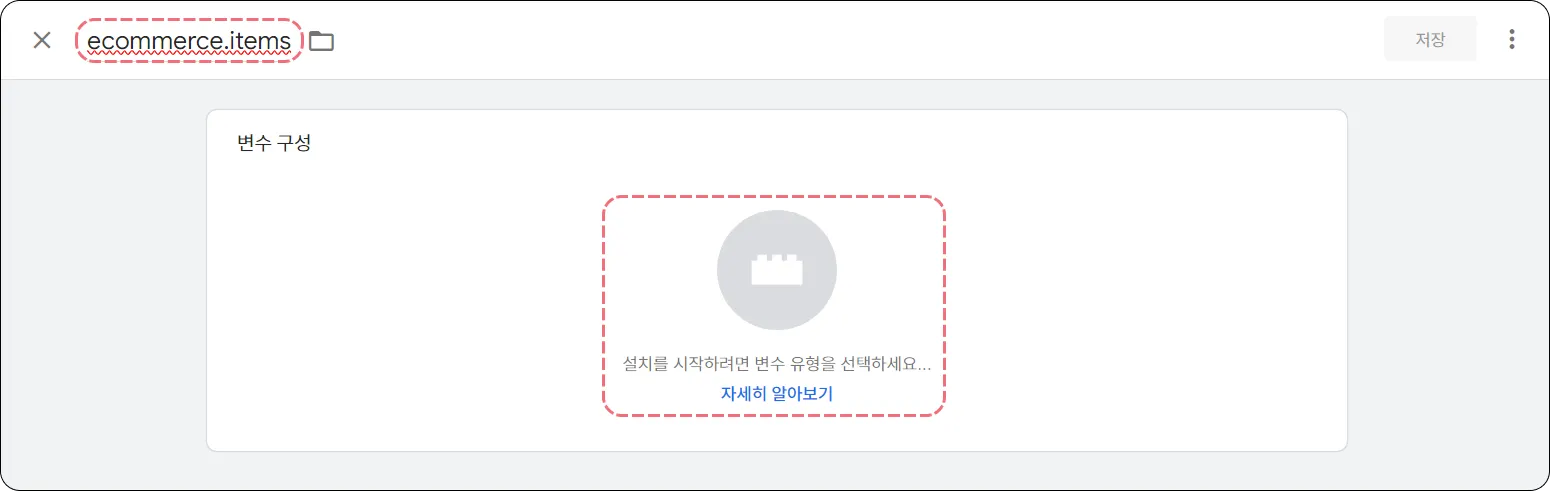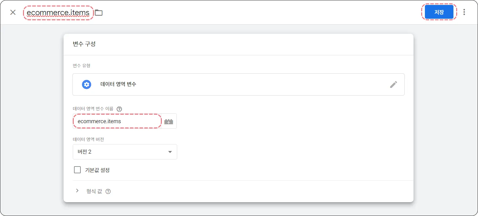 데이터 영역 변수 이름에 ecommerce.items(변수명)를 입력 후 저장 을 눌러주세요.