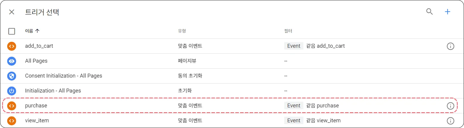 트리거 선택 아이콘을 클릭하고 트리거 purchase를 선택해 주세요.
