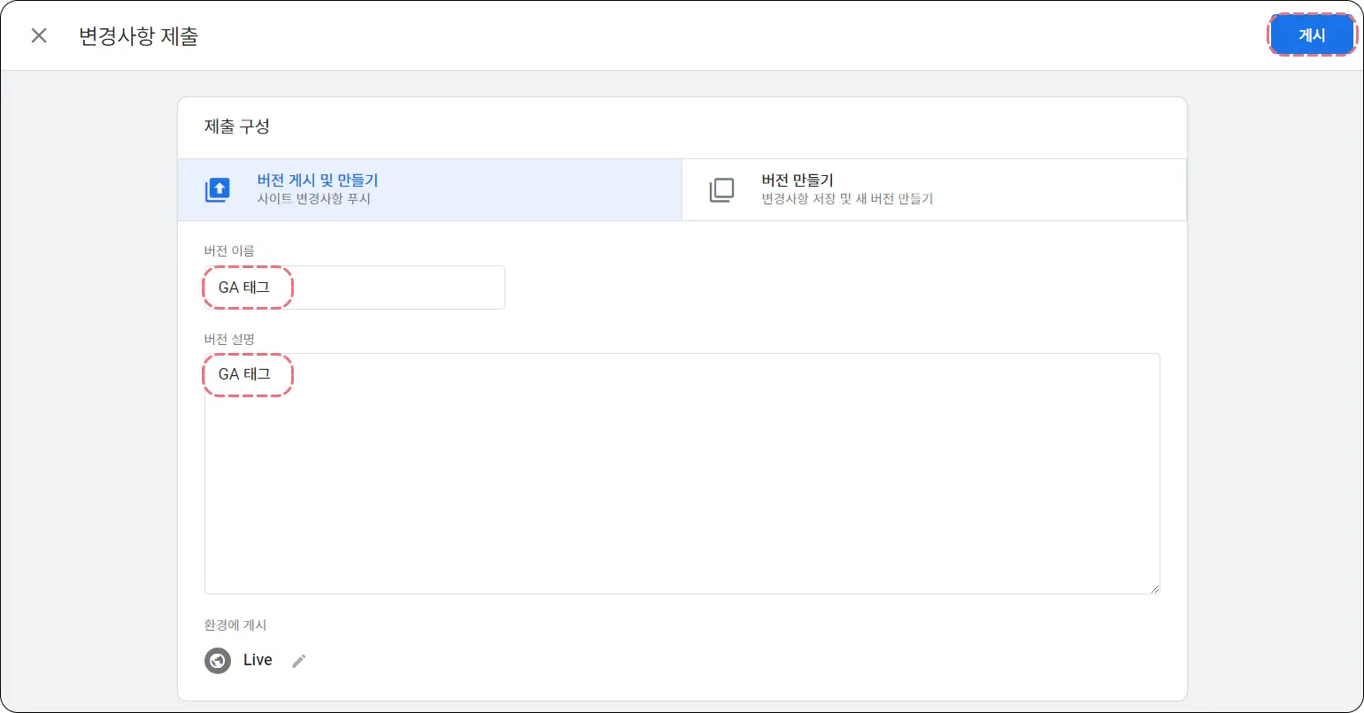 버전 이름, 버전 설명을 입력하고 게시를 눌러주시면 됩니다.