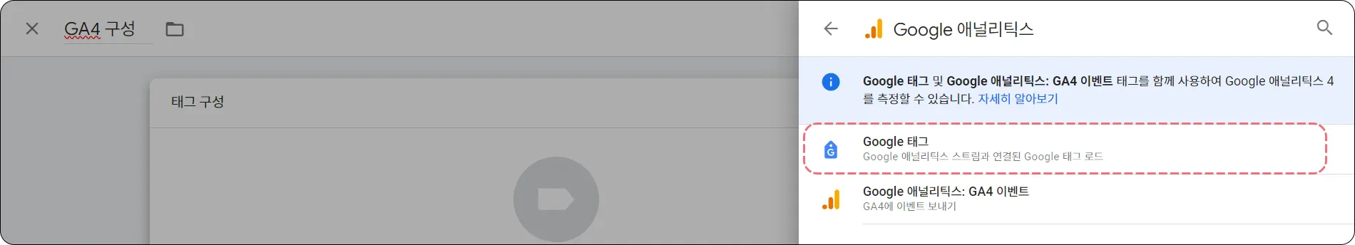 태그 유형에서 Google 애널리틱스를 클릭하고, ‘Google 태그’를 선택해 주세요.