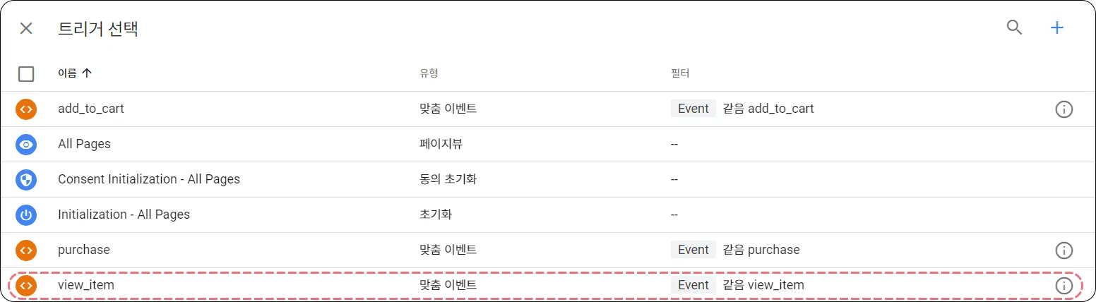 트리거 선택 아이콘을 클릭하여 트리거 view_item를 선택해 주세요.