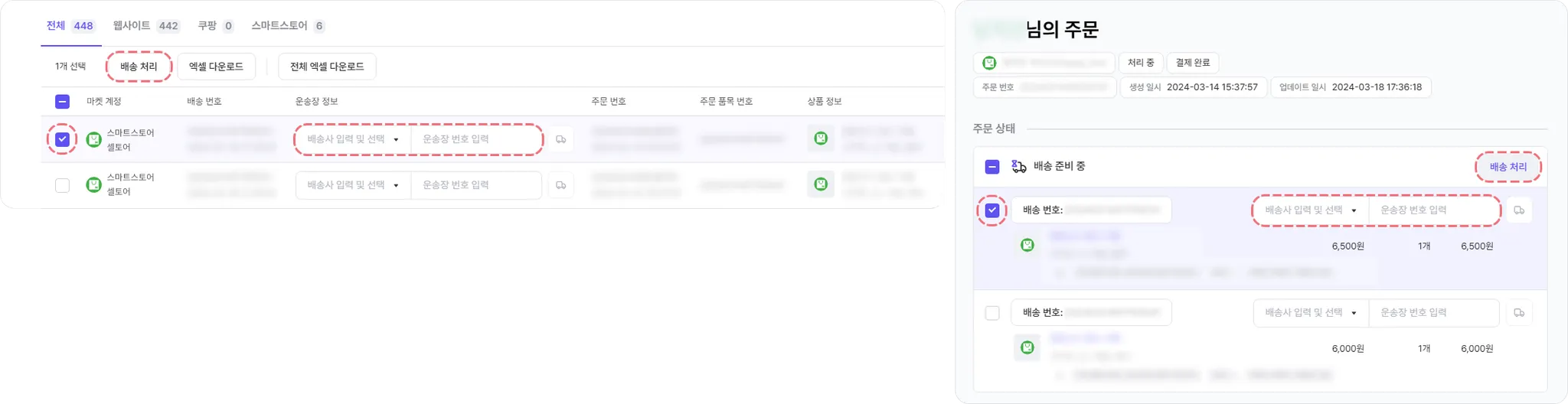주문 목록에서 배송 처리 시 운송장 정보는 필수로 입력되어야 합니다.