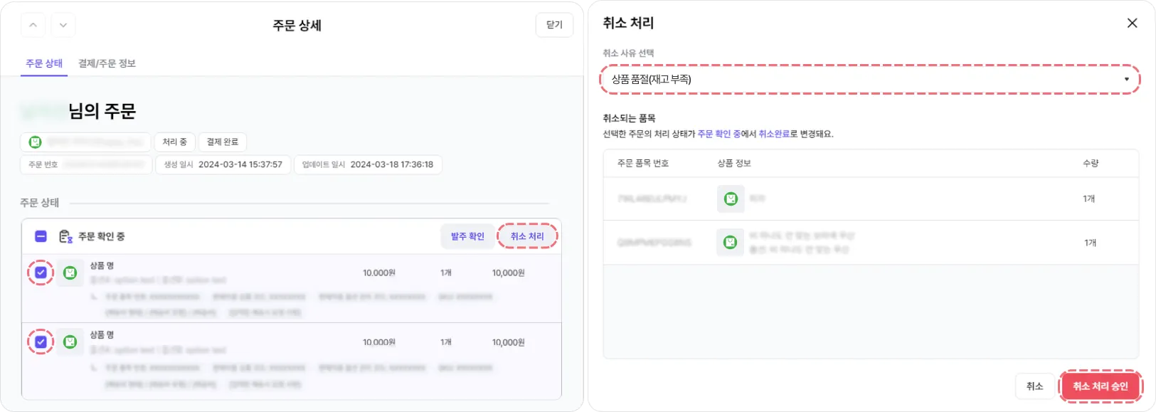주문 확인 중 상태의 주문을 주문 상세에서 품목 단위 취소 처리할 수 있습니다.