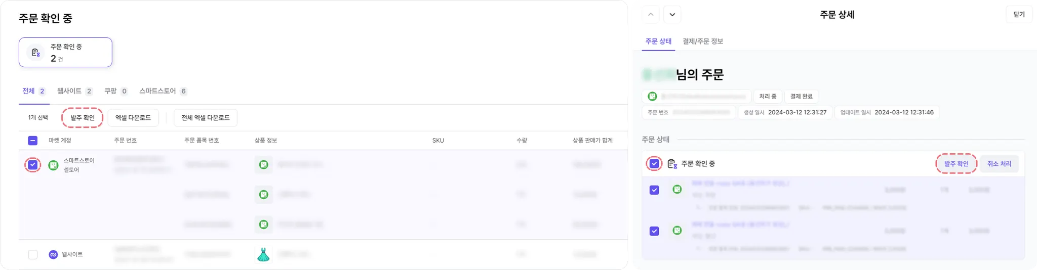 [식스샵 프로 > 주문 관리 > 주문 확인 중] 주문 목록 또는 주문 상세에서 스마트스토어의 주문 번호 단위로 발주 확인 처리할 수 있습니다. 발주 확인된 주문은 배송 준비 중 상태로 변경되며 배송 처리 메뉴로 이동합니다.