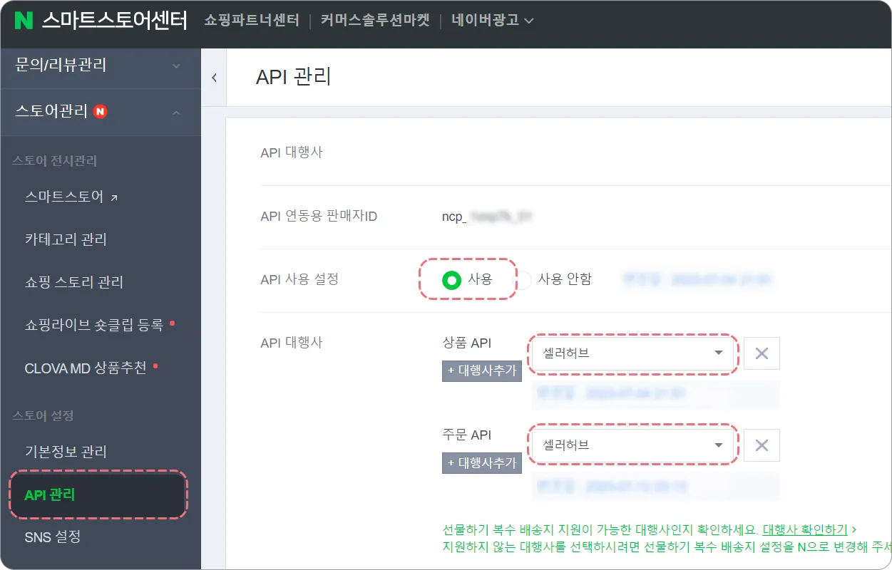 ④ API 사용 설정을 사용 설정 후, 상품 API와 주문 API를 셀러허브로 선택하고 저장 해주세요.