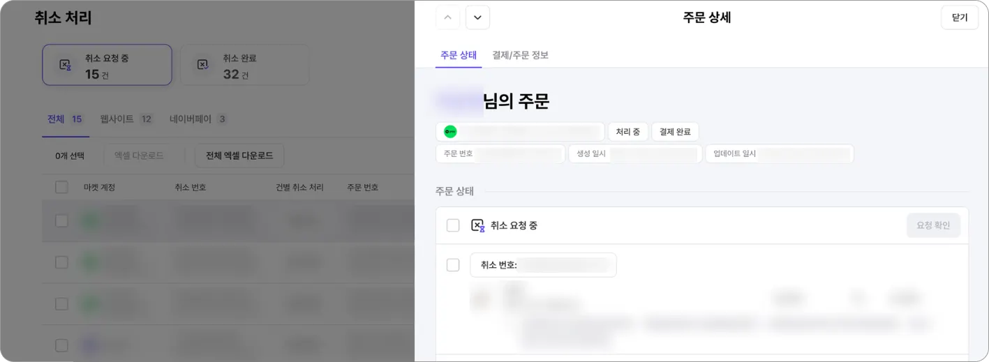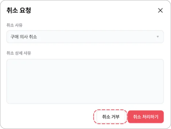 취소 불가 상품 등 여러 사유로 취소 승인이 어려운 상태라면, 취소 거부 처리할 수 있습니다.