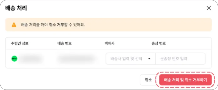 배송 처리를 위해 운송정 정보 입력 후 배송 처리 및 취소 거부하기 클릭