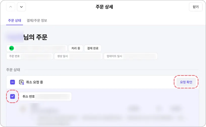 취소 거부할 품목 선택 후 요청 확인 클릭