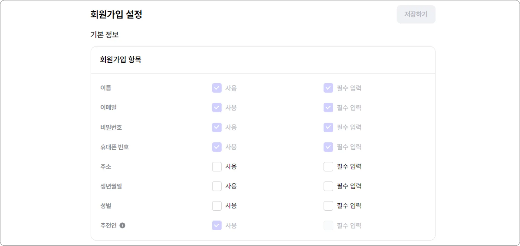 회원 가입 시 고객에게 수집할 정보를 설정할 수 있습니다.