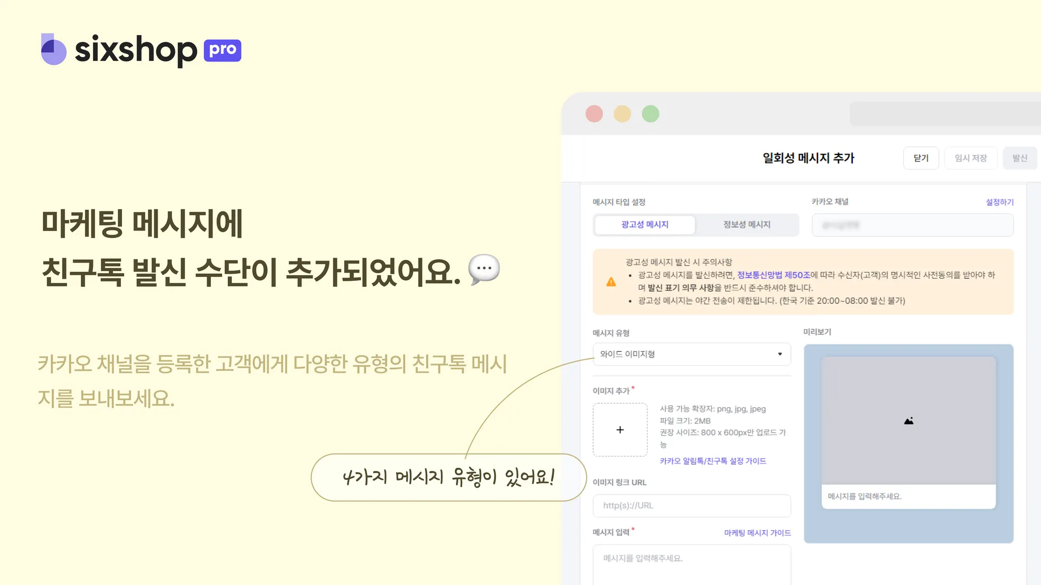 카카오톡 친구톡은 카카오 채널을 추가한 이용자에게만 발송되며, 캐러셀 이미지형 친구톡은 광고성 메시지 유형으로만 발송할 수 있어요.