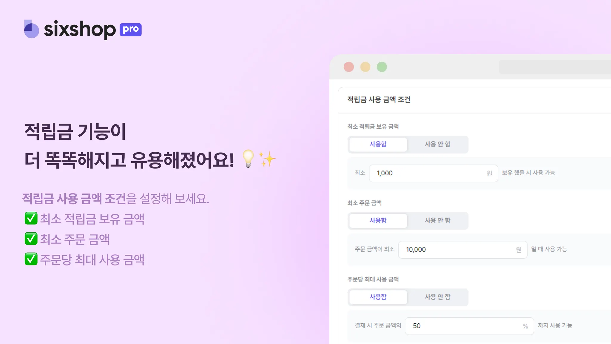 적립금 사용 금액 조건을 설정하고, 효율적으로 판매에 활용해 보세요!