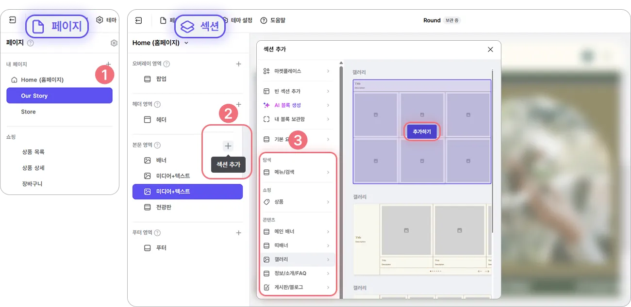 ② 상단의 [섹션] 선택 후 콘텐츠를 추가하려는 영역(헤더 영역, 본문 영역, 푸터 영역) 옆 +(섹션 추가)를 클릭