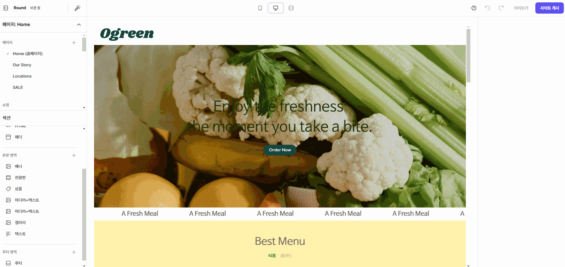 웹사이트 전체 페이지에 공통 적용되는 섹션으로, 페이지 최상단에 위치하며 헤더 영역 내에서 순서를 변경할 수 있습니다.