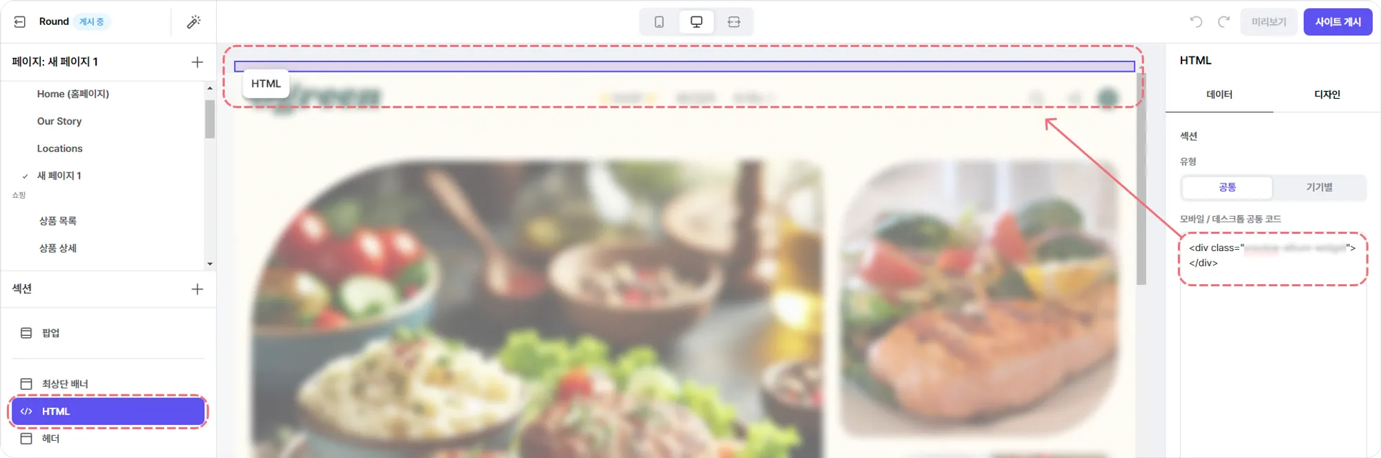 직접 입력한 소스코드를 웹사이트에 적용할 수 있습니다. 외부 서비스에서 제공하는 소스코드를 추가하거나 웹사이트 디자인 변경 등 자유롭게 활용해 보세요.