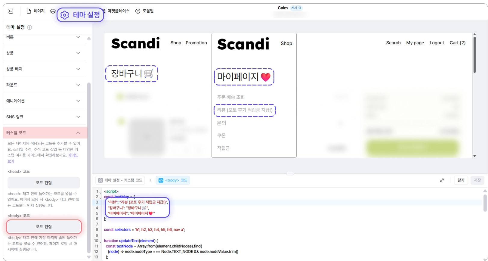 장바구니, 리뷰, 문의, 마이페이지 등 기본으로 제공되는 페이지의 이름을 아래 코드를 활용해 원하는 문구로 변경할 수 있어요.