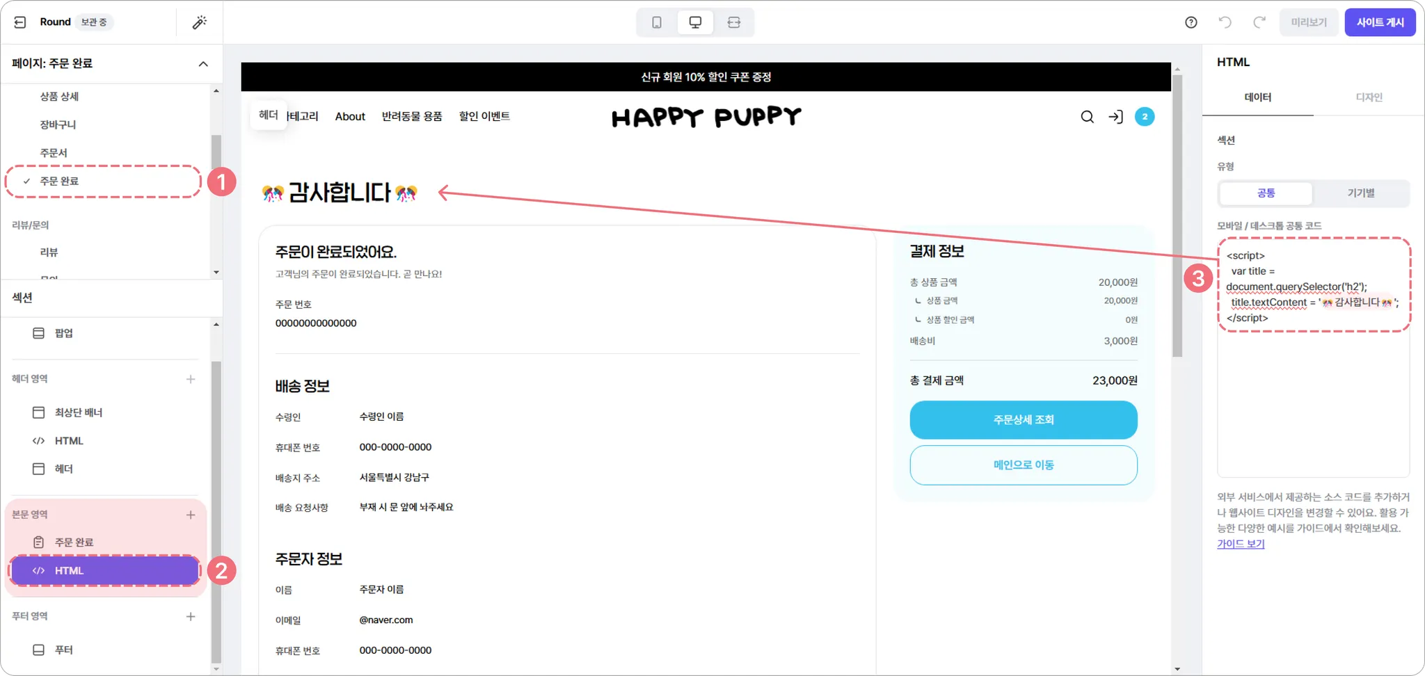 헤더 영역의 HTML 섹션은 웹사이트 전체 페이지에 공통 적용되는 섹션으로, 사이트 전체 페이지의 제목이 일괄 변경됩니다. 특정 페이지의 제목만 변경되도록 본문 영역에 HTML 섹션을 추가하여 작업해 주세요.
