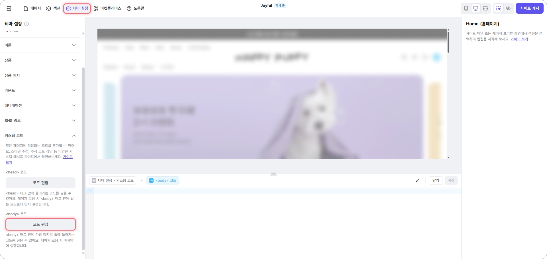 아래 소스코드를 [테마 설정 > 커스텀 코드]의 <body> 코드에 입력해 주세요.