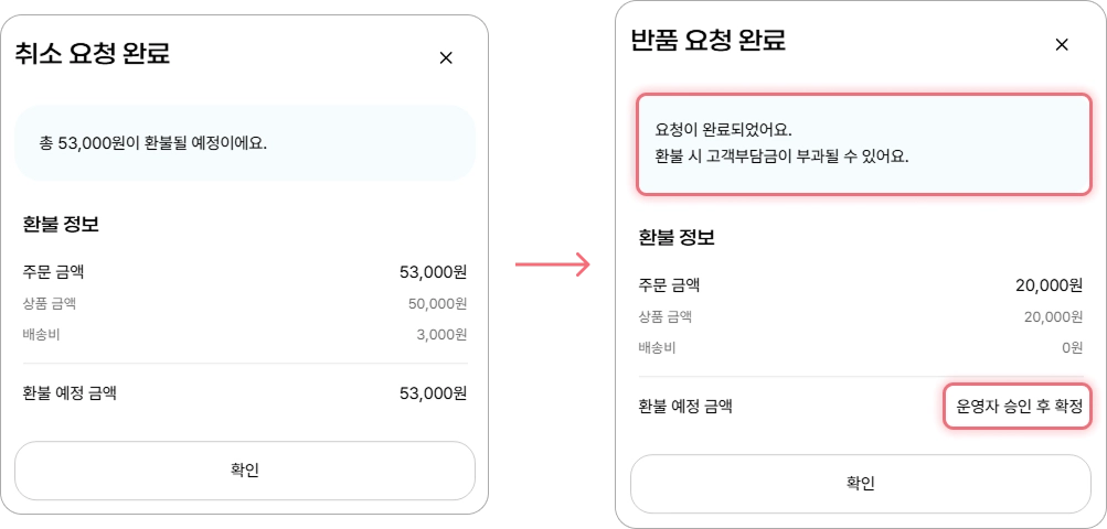 취소 또는 반품 요청 시 나타나는 모달 창의 문구를 요청이 완료되었어요. 환불 시 고객 부담금이 부과될 수 있어요로 대체하고, 환불 예정 금액을 운영자 승인 후 확정으로 표시할 수 있어요.