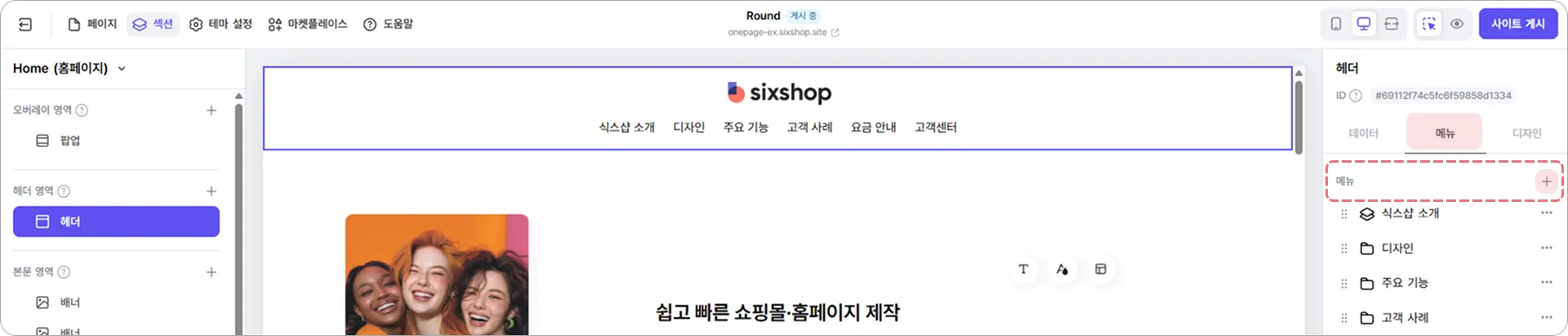 식스샵을 예시로 식스샵 소개, 디자인, 주요 기능, 고객 사례, 고객센터를 한 페이지에 구성해 볼게요.