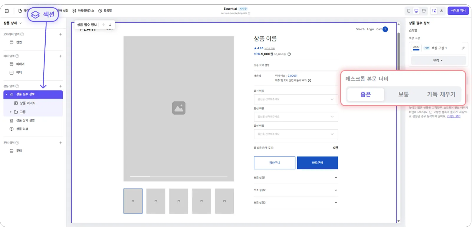 디자인 에디터 상단 [섹션] 클릭 후, 너비 설정을 원하는 섹션을 선택하면 오른쪽 패널에서 데스크톱 본문 너비를 설정할 수 있습니다.
