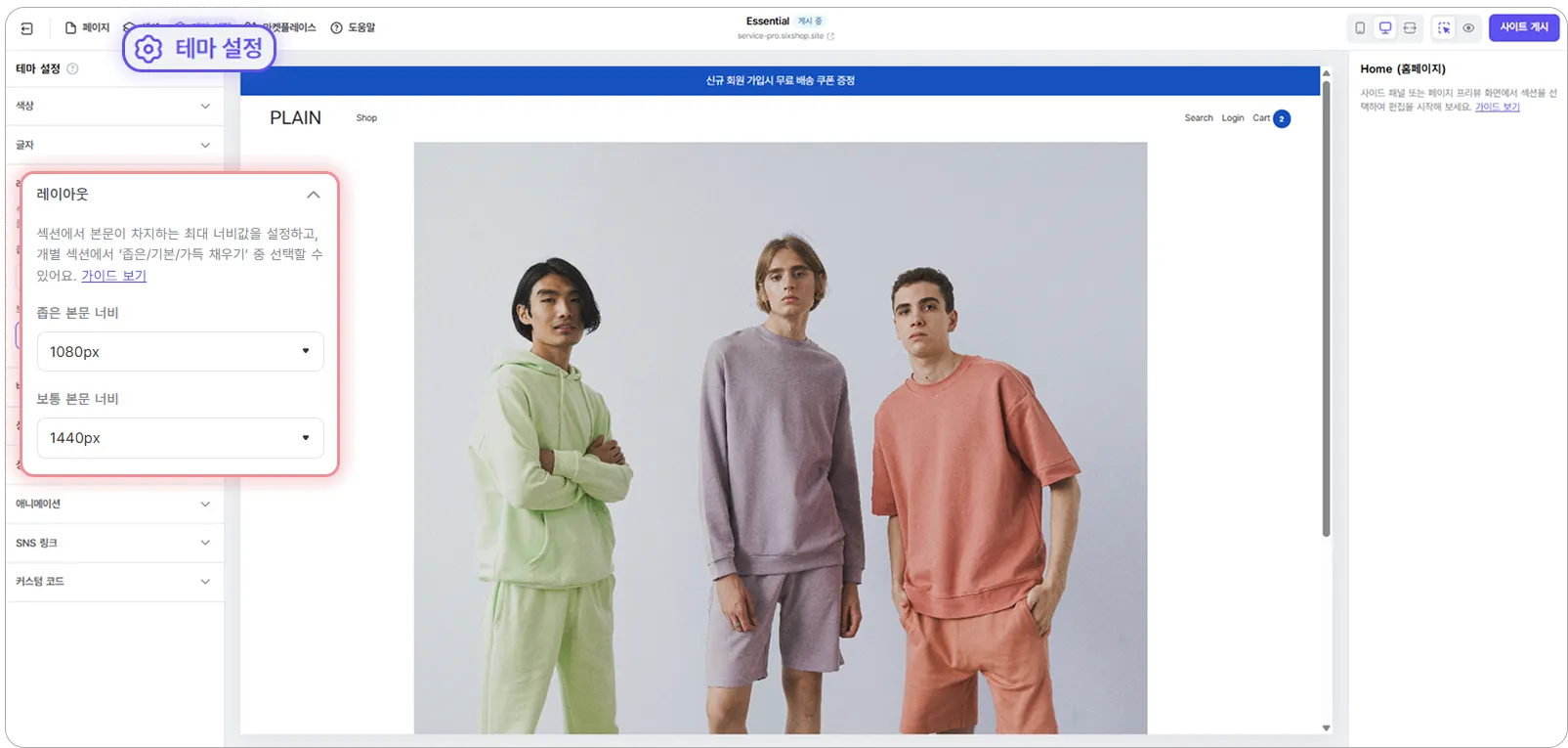 디자인 에디터 상단 [테마 설정] 클릭 후, 레이아웃 항목에서 좁은 본문 너비와 보통 본문 너비의 값을 설정할 수 있습니다.