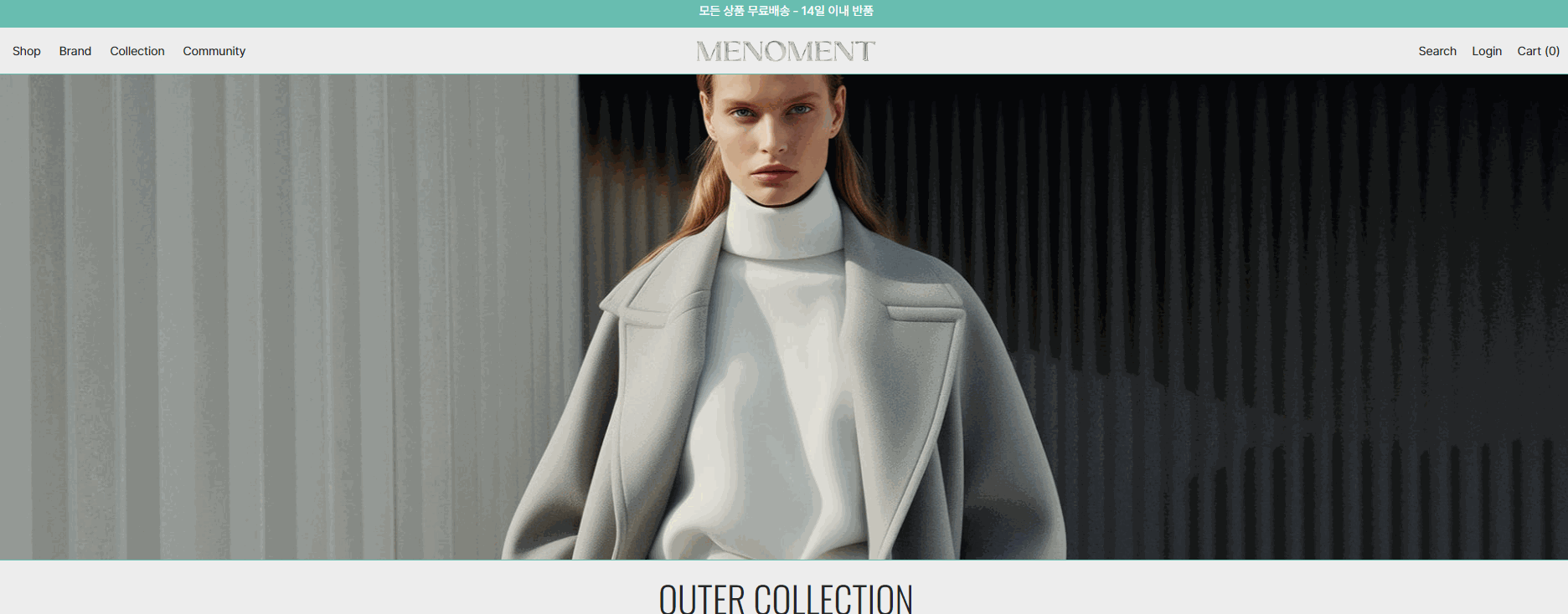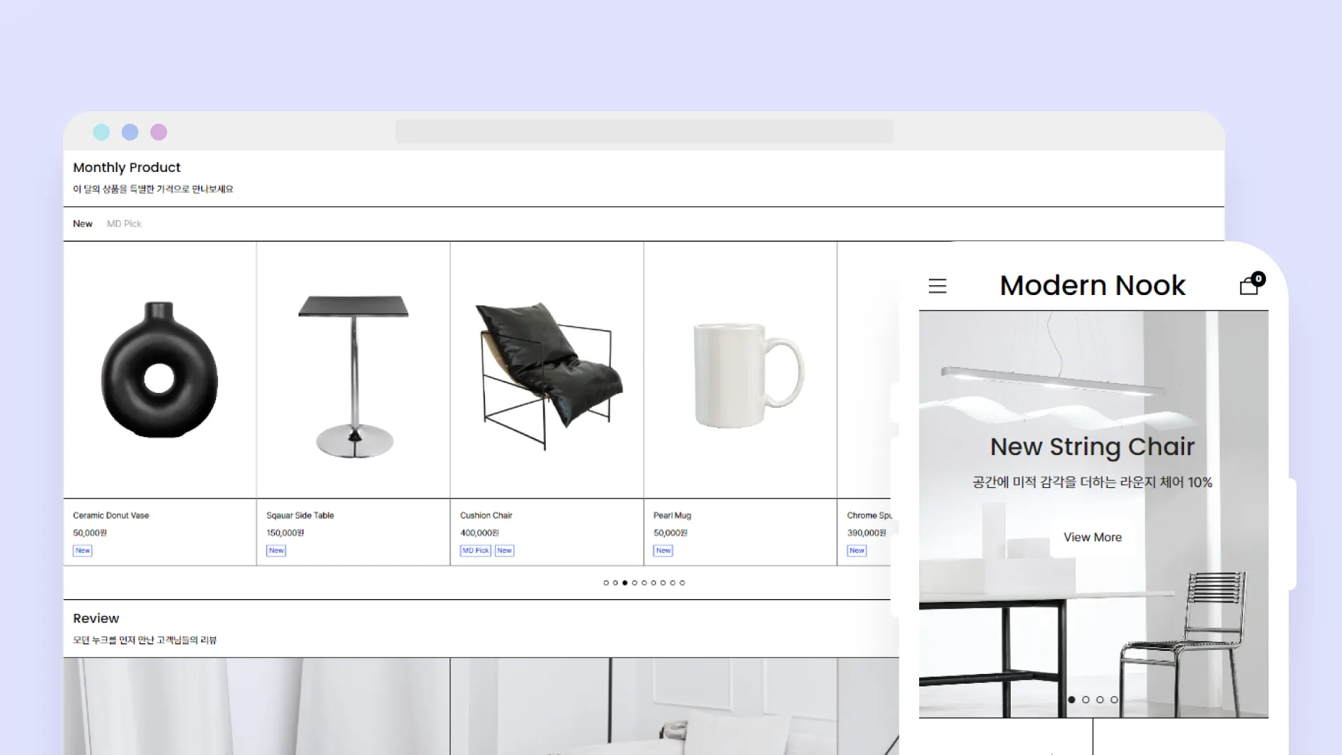 절제된 라인 요소가 트렌디한 느낌을 줘요. 와이드한 너비의 이미지를 카탈로그, 상품 큐레이션 페이지로 구성하기에도 적합해요.