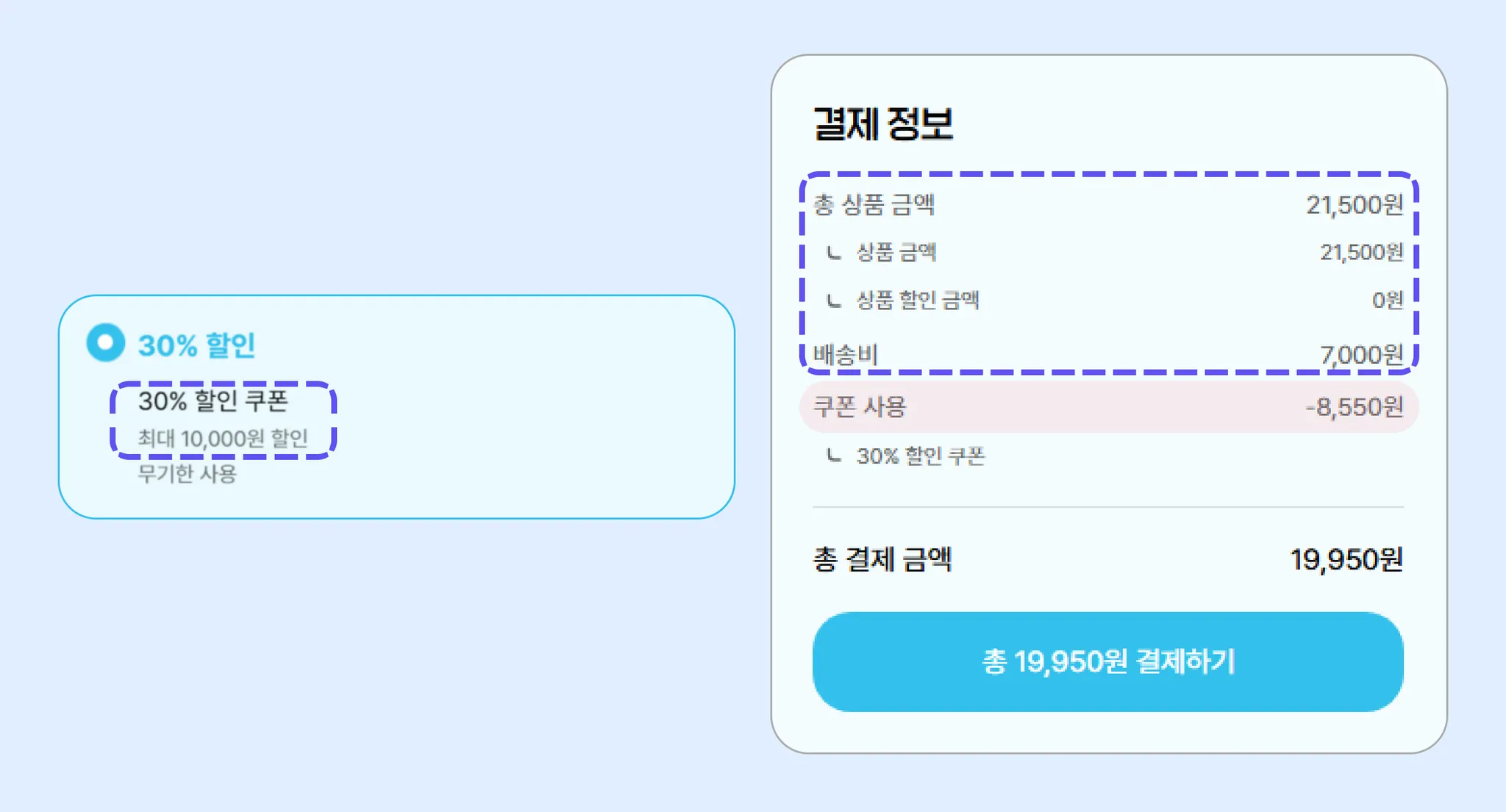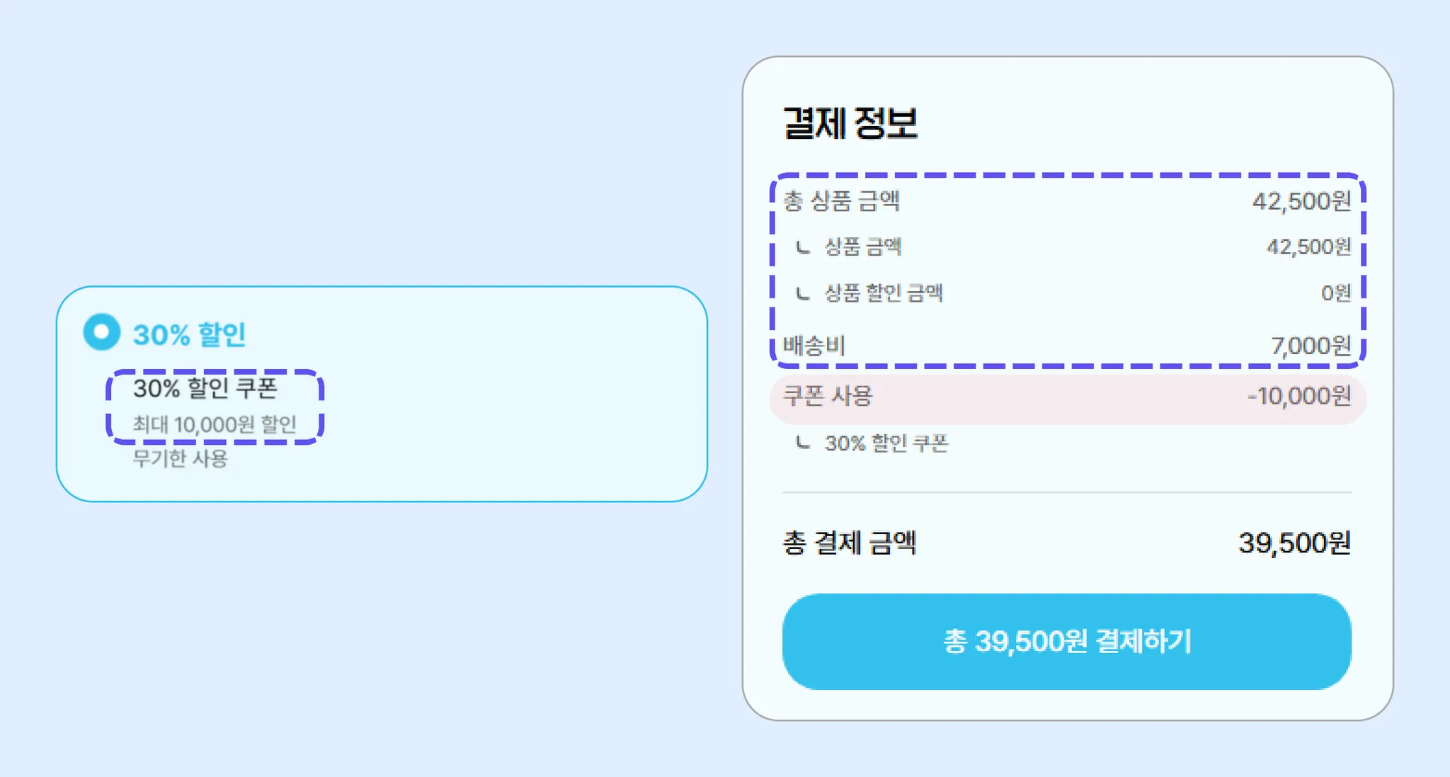 (상품 합계 금액 + 배송비) - 쿠폰 최대 할인 금액