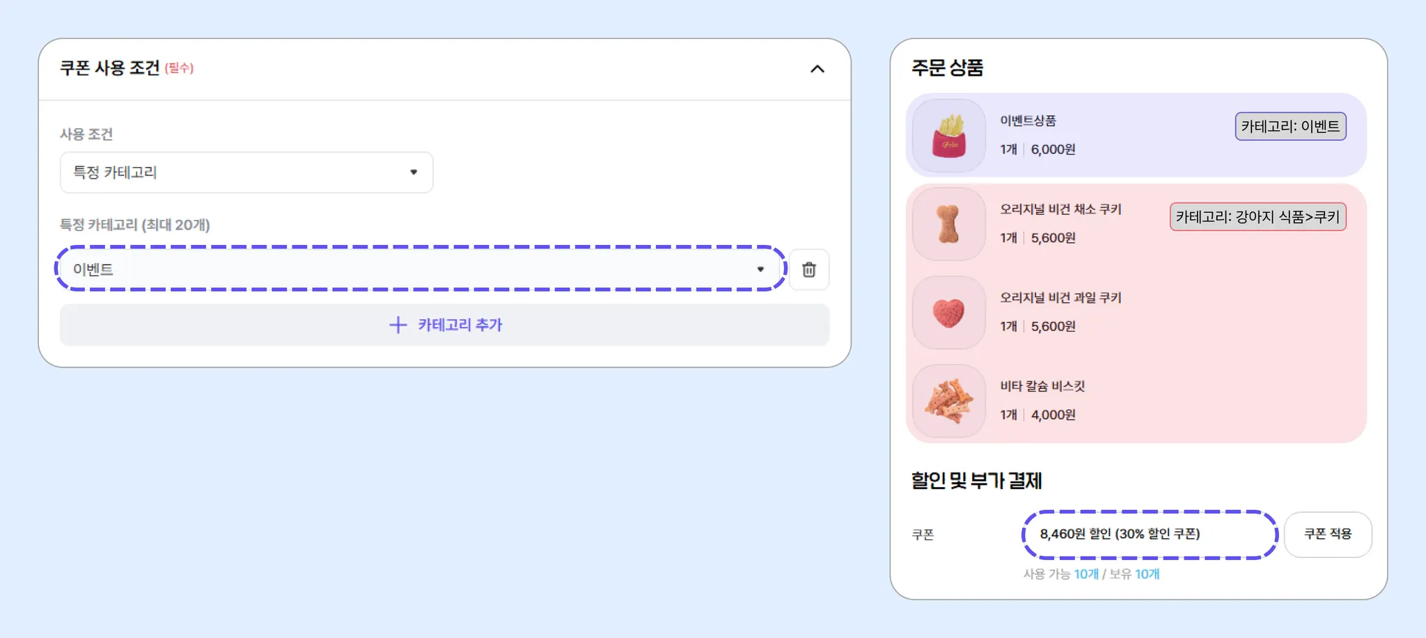 특정 카테고리 상품을 함께 구매하면, 주문서에 포함된 모든 상품에 할인이 적용돼요.