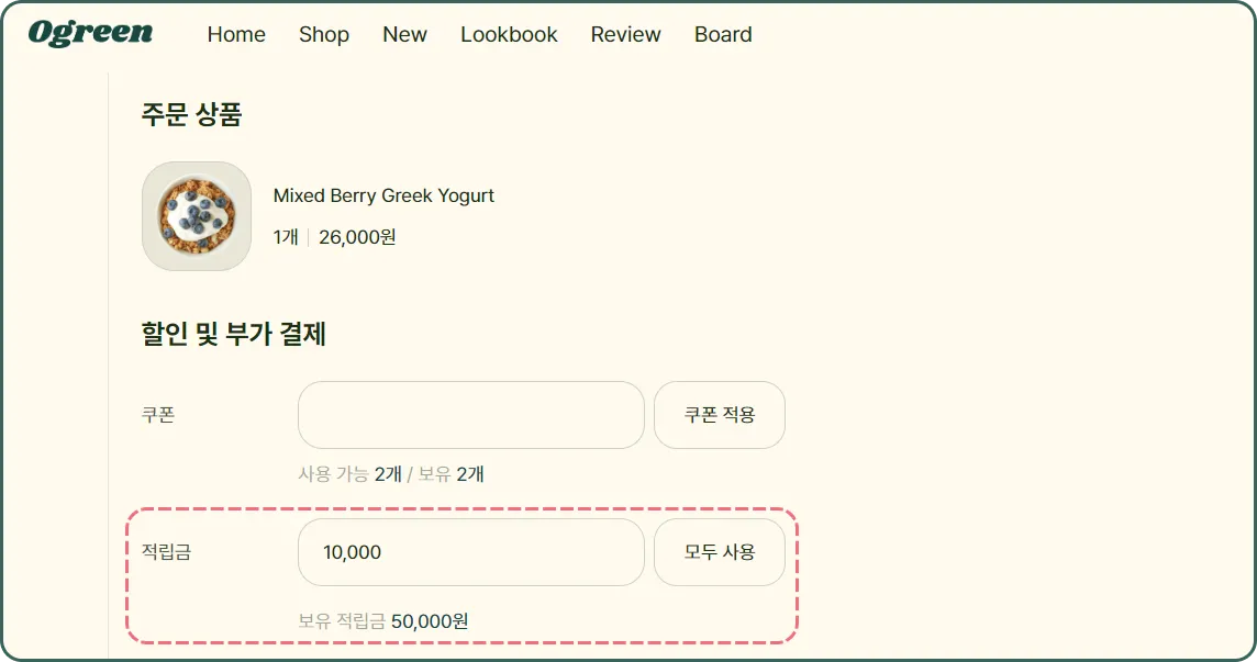 주문 시 설정한 비율까지만 적립금을 사용하여 결제할 수 있어요.