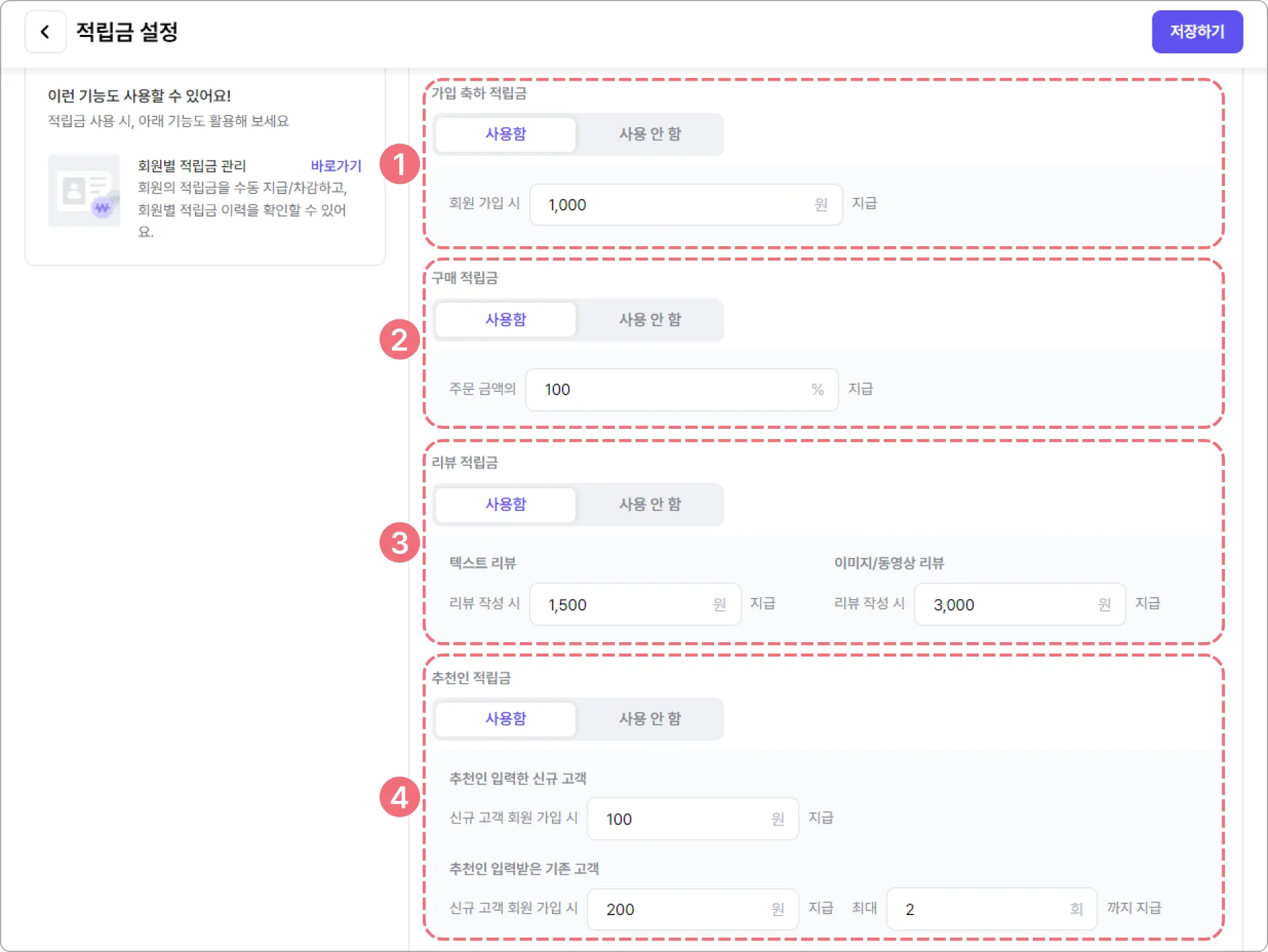 적립금은 회원가입이나 재구매 유도에 가장 효과적인 수단입니다.