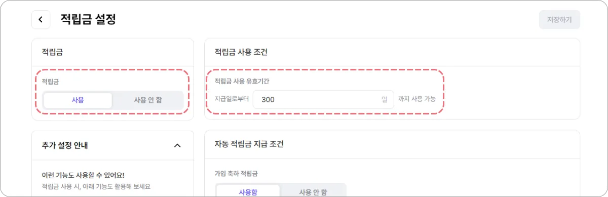 [식스샵 프로 > 설정 > 적립금 설정]에서 적립금 사용 여부와 유효 기간을 설정할 수 있습니다.